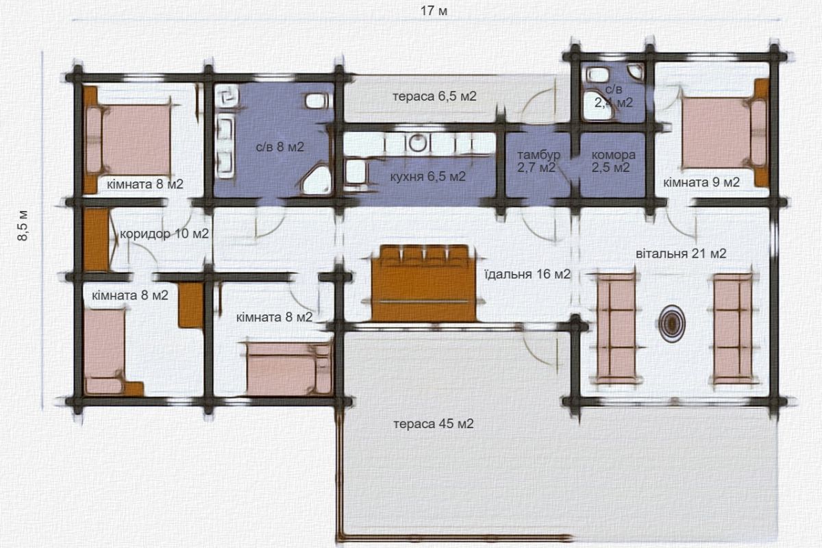 БУДИНОК З ДЕРЕВА ПРОЕКТ СКАНДИНАВСЬКОГО БУДИНКУ "НОВИК" СПАЛЕНЬ: 4ГАБАРИТИ: 8.5×17 мПЛОЩА: 110 кв. м Замовити консультацію Будівельна компанія "КОЛЕО" Facebook Instagram Tiktok Переглянути інші проекти Зруб будинку з лафета, брусу або колоди Розміри та планування у цьому проекті можна змінити за Вашим бажанням.Це класичний норвезький одноповерховий будинок.У центральній частині будинку розташовується кухня-їдальня загальною площею понад 20 кв.м.Також у будинку передбачено чотири спальні, одна з яких майстер-спальня. Ванна кімната з вікнами.Дві відкриті тераси невелика 6,5 кв.м. та велика 45 кв.м.! Зателефонуйте нам